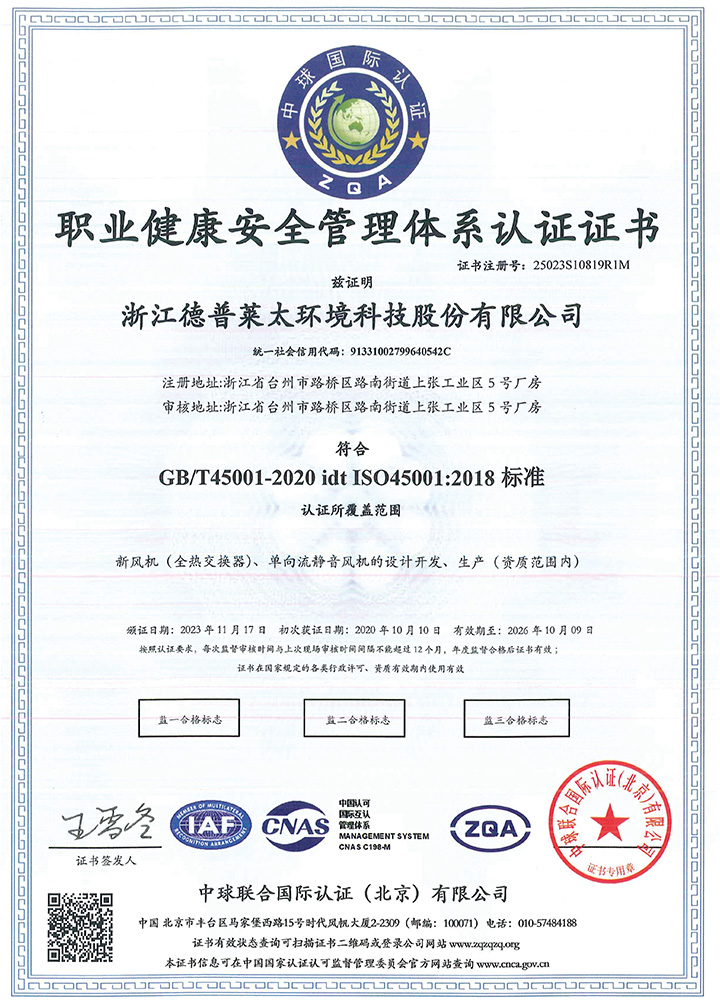 公司秉承“誠信、擔(dān)當(dāng)、創(chuàng)新、共贏”的企業(yè)精神,產(chǎn)品制造精益求精,通過了ISO9001質(zhì)量管理體系、ISO14001環(huán)境管理體系、ISO45001職業(yè)健康安全管理體系等認(rèn)證。主導(dǎo)起草了T∕NAIC 001-2021《超低能耗建筑新風(fēng)系統(tǒng)技術(shù)規(guī)程》、RISN-TG043-2022《居住建筑新風(fēng)系統(tǒng)應(yīng)用技術(shù)導(dǎo)則》等標(biāo)準(zhǔn),參編了JGJ∕440-2018《住宅新風(fēng)系統(tǒng)技術(shù)標(biāo)準(zhǔn)》、GB∕T 21087-2020《熱回收新風(fēng)機(jī)組》、GB∕T 40438-2021《熱泵型新風(fēng)環(huán)境控制一體機(jī)》、GB∕T 40379-2021《戶用和類似用途組合式空氣處理機(jī)組》等多項(xiàng)標(biāo)準(zhǔn),擁有發(fā)明專利6項(xiàng)。公司是中國建筑金屬結(jié)構(gòu)協(xié)會(huì)凈化與新風(fēng)委員會(huì)副主任單位、被動(dòng)式低能耗建筑產(chǎn)業(yè)技術(shù)創(chuàng)新戰(zhàn)略聯(lián)盟副理事長單位,被授予高新技術(shù)企業(yè)、浙江省專精特新中小企業(yè)、浙江省科技型中小企業(yè)、臺(tái)州市專精特新小巨人企業(yè)和國家級(jí)綠色(設(shè)計(jì))產(chǎn)品、浙江制造精品、浙江制造認(rèn)證證書等多項(xiàng)榮譽(yù)。